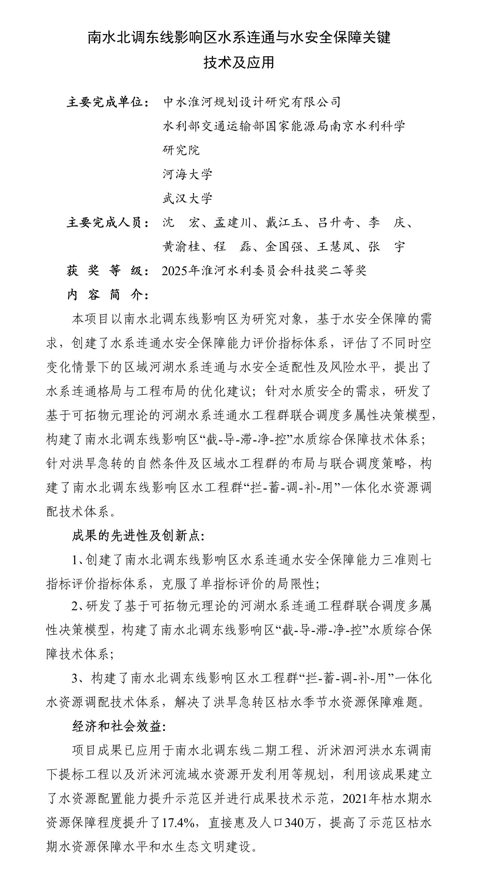 南水北调东线影响区水系连通与水安全保障关键技术及应用