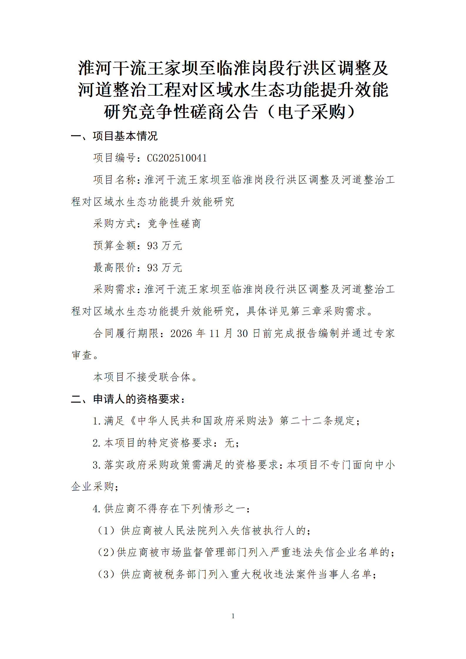 淮河干流王家坝至临淮岗段行洪区调整及河道整治工程对区域水生态功能提升效能研究竞争性磋商公告(电子采购)