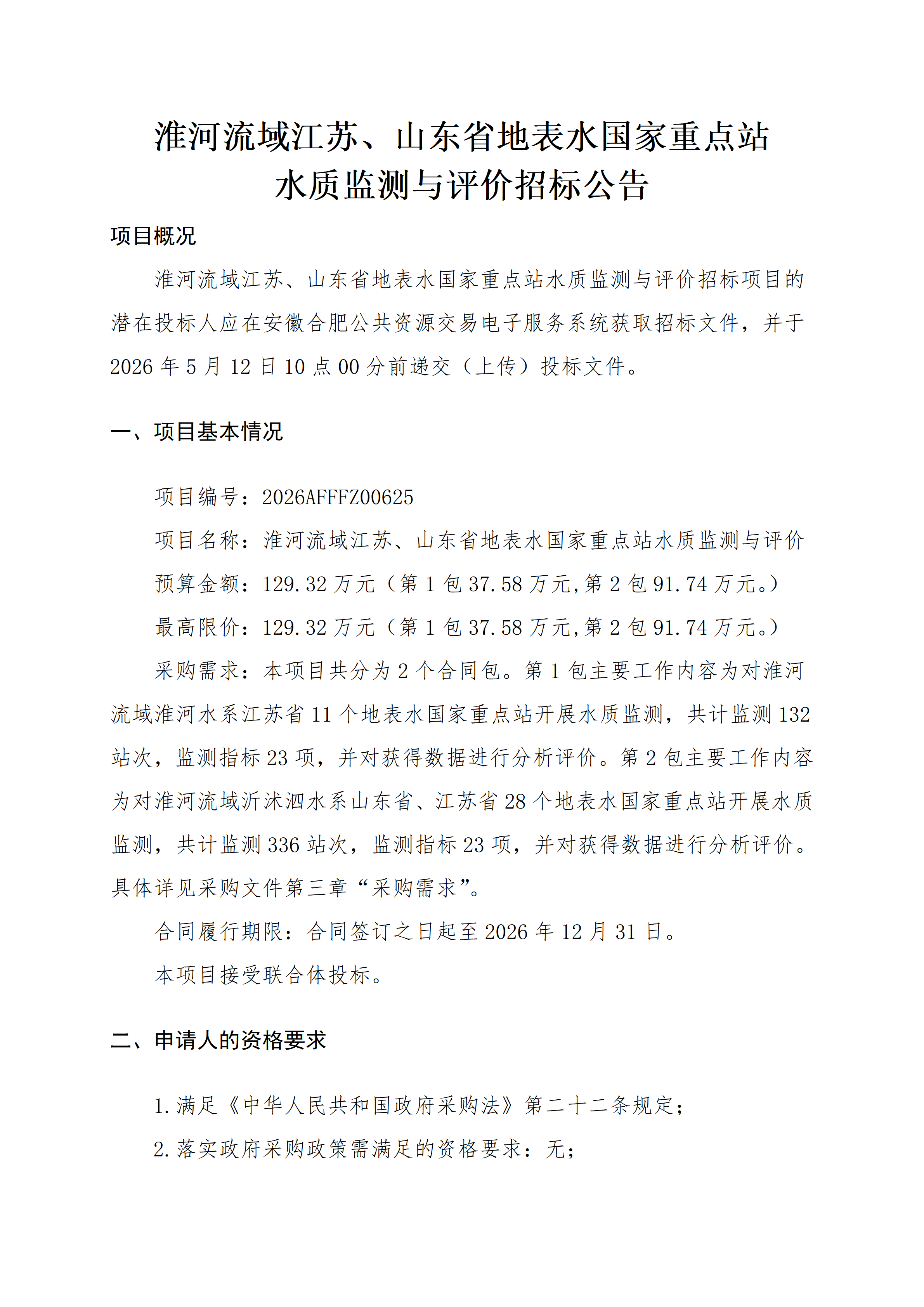 淮河流域江苏、山东省地表水国家重点站水质监测与评价招标公告