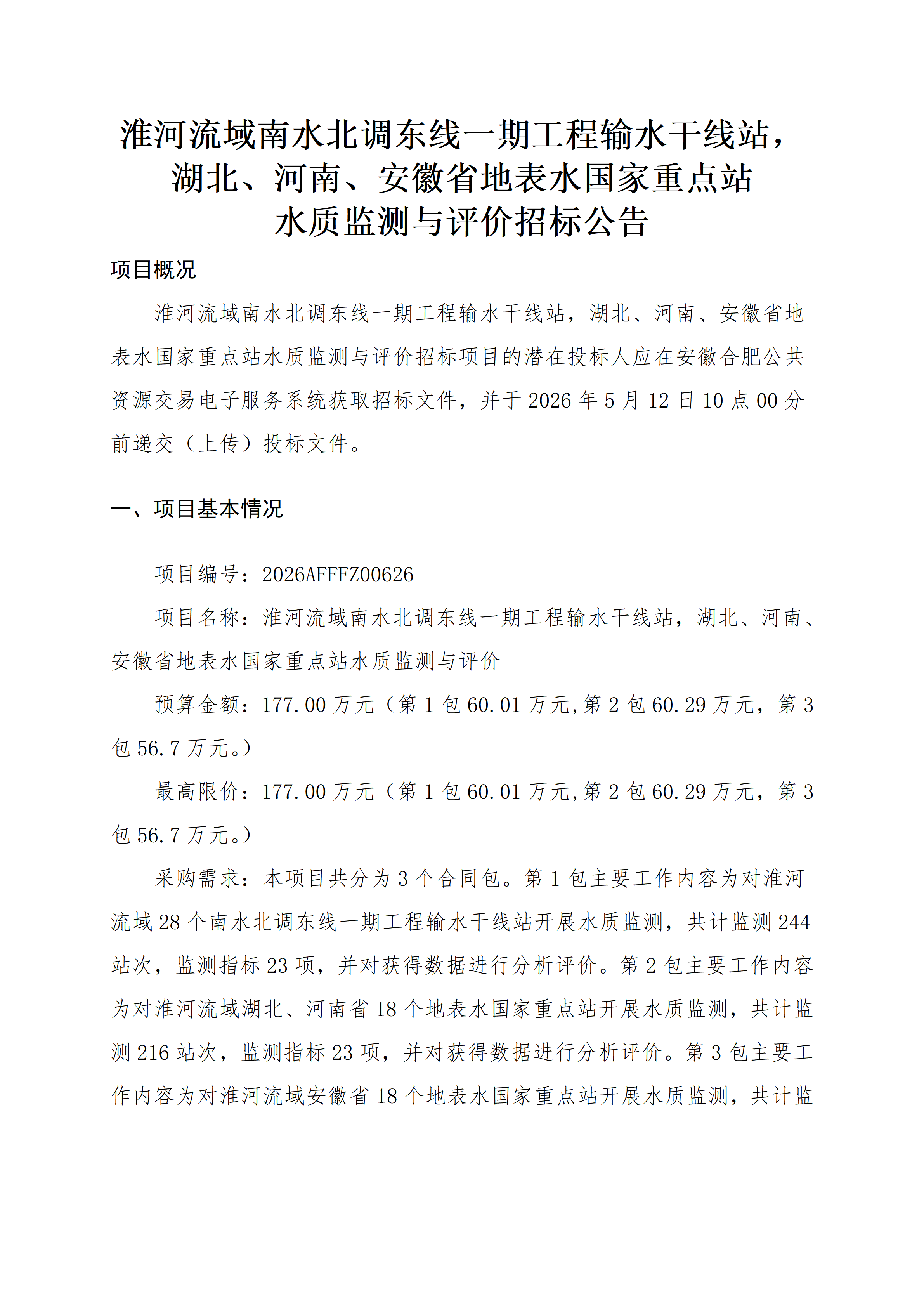 淮河流域南水北调东线一期工程输水干线站,湖北、河南、安徽省地表水国家重点站水质监测与评价招标公告
