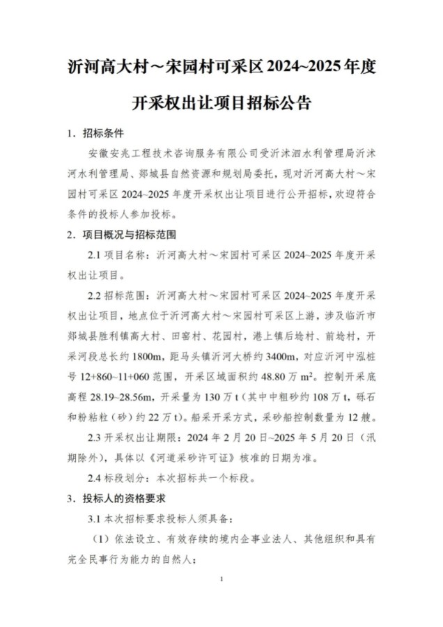 沂河高大村~宋园村可采区2024~2025年度开采权出让项目招标公告