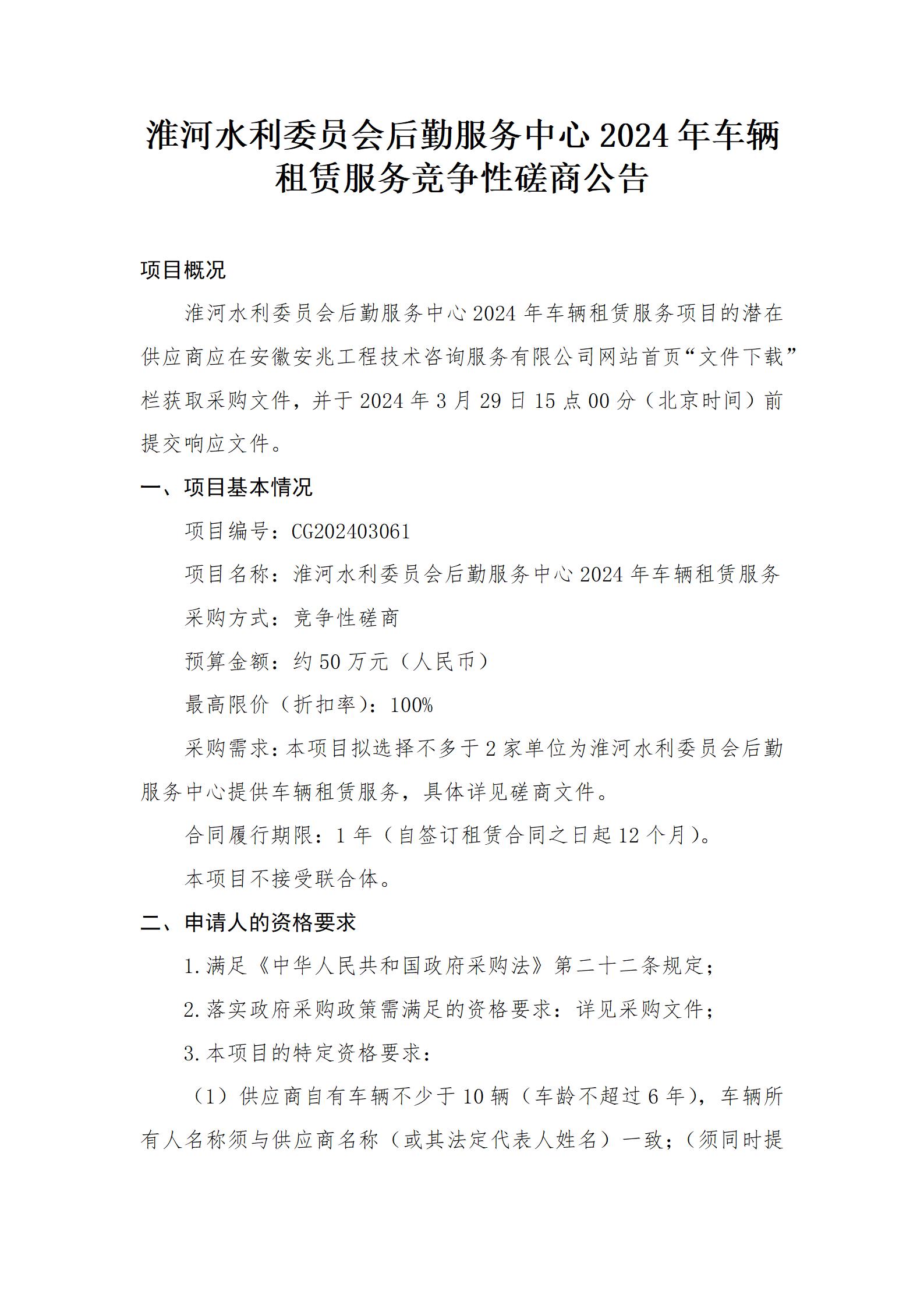淮河水利委员会后勤服务中心2024年车辆租赁服务竞争性磋商公告