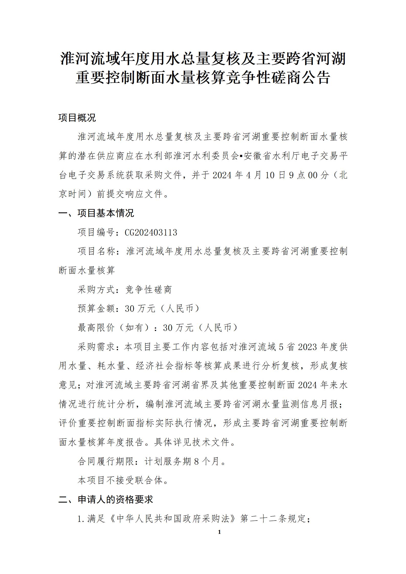 淮河流域年度用水总量复核及主要跨省河湖重要控制断面水量核算竞争性磋商公告