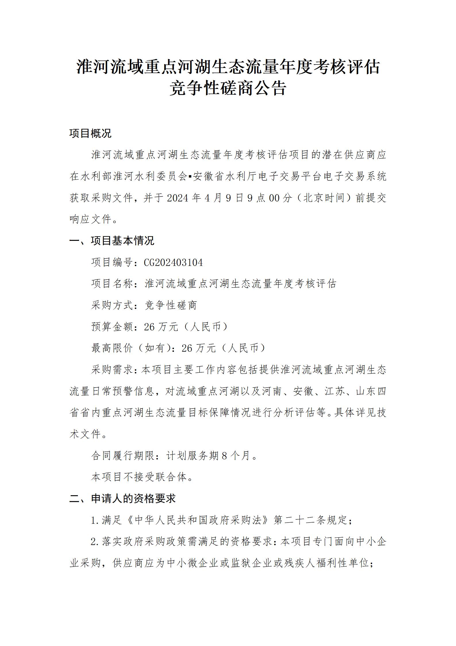 淮河流域重点河湖生态流量年度考核评估竞争性磋商公告