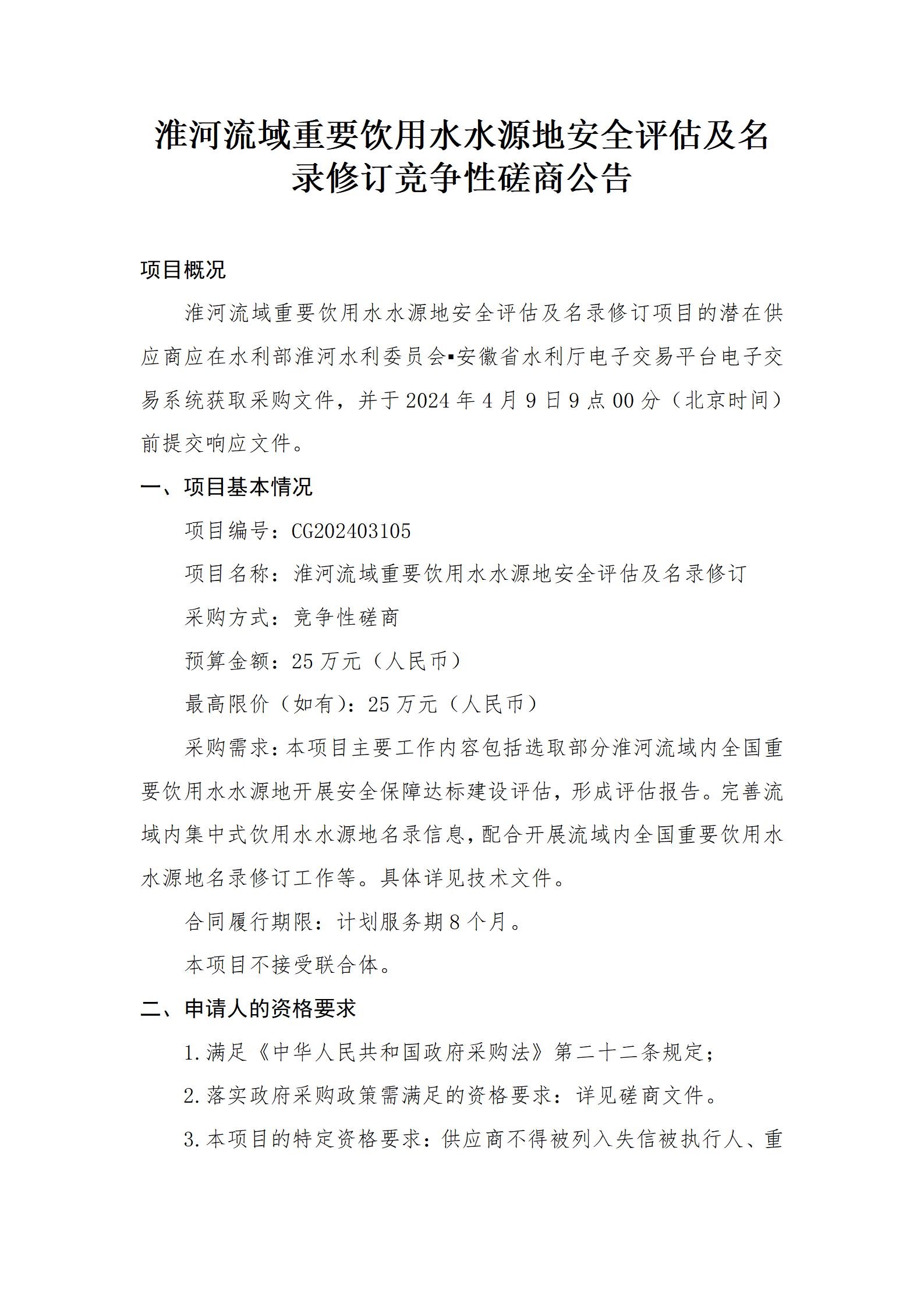 淮河流域重要饮用水水源地安全评估及名录修订竞争性磋商公告