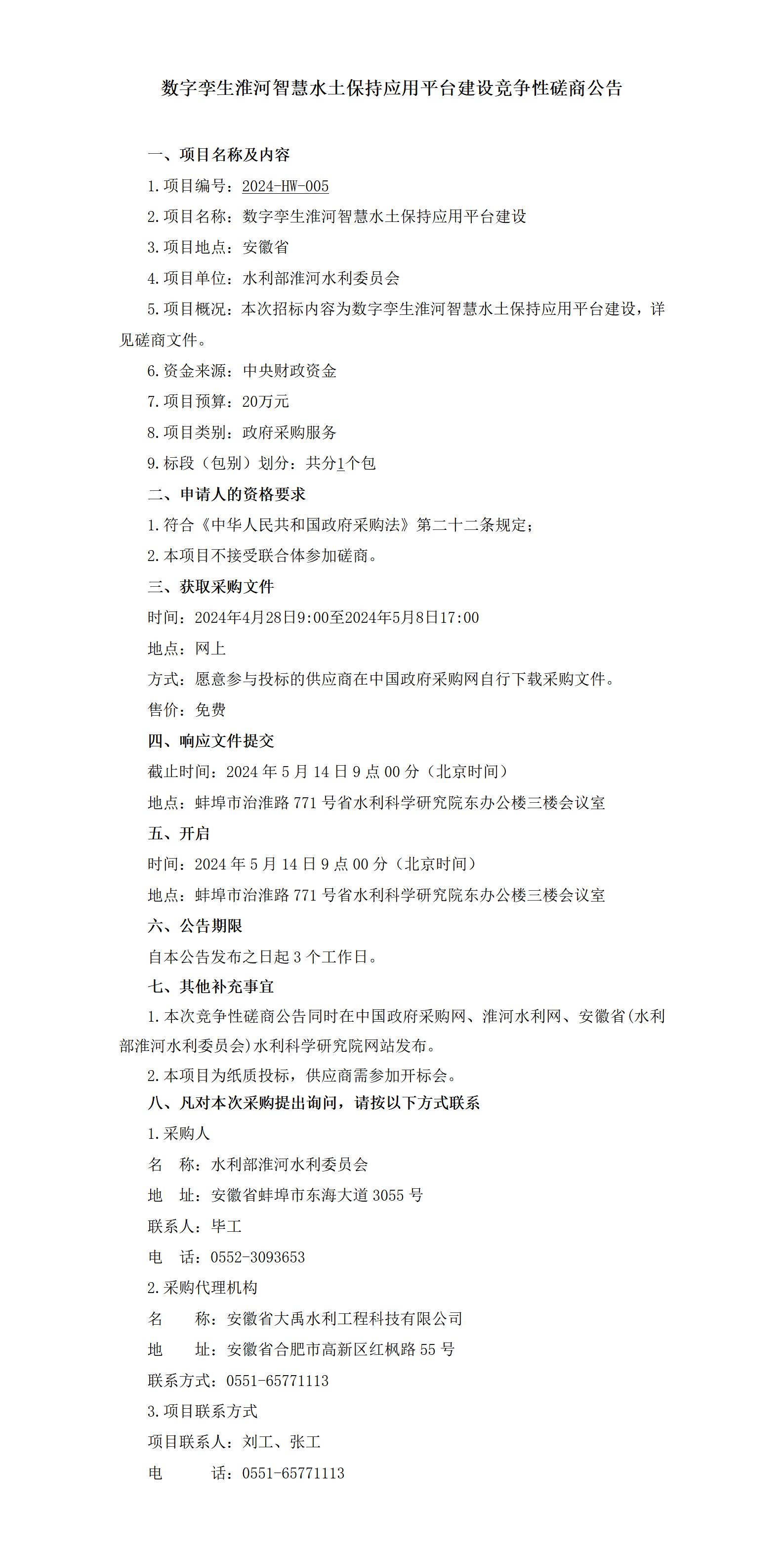 数字孪生淮河智慧水土保持应用平台建设竞争性磋商公告