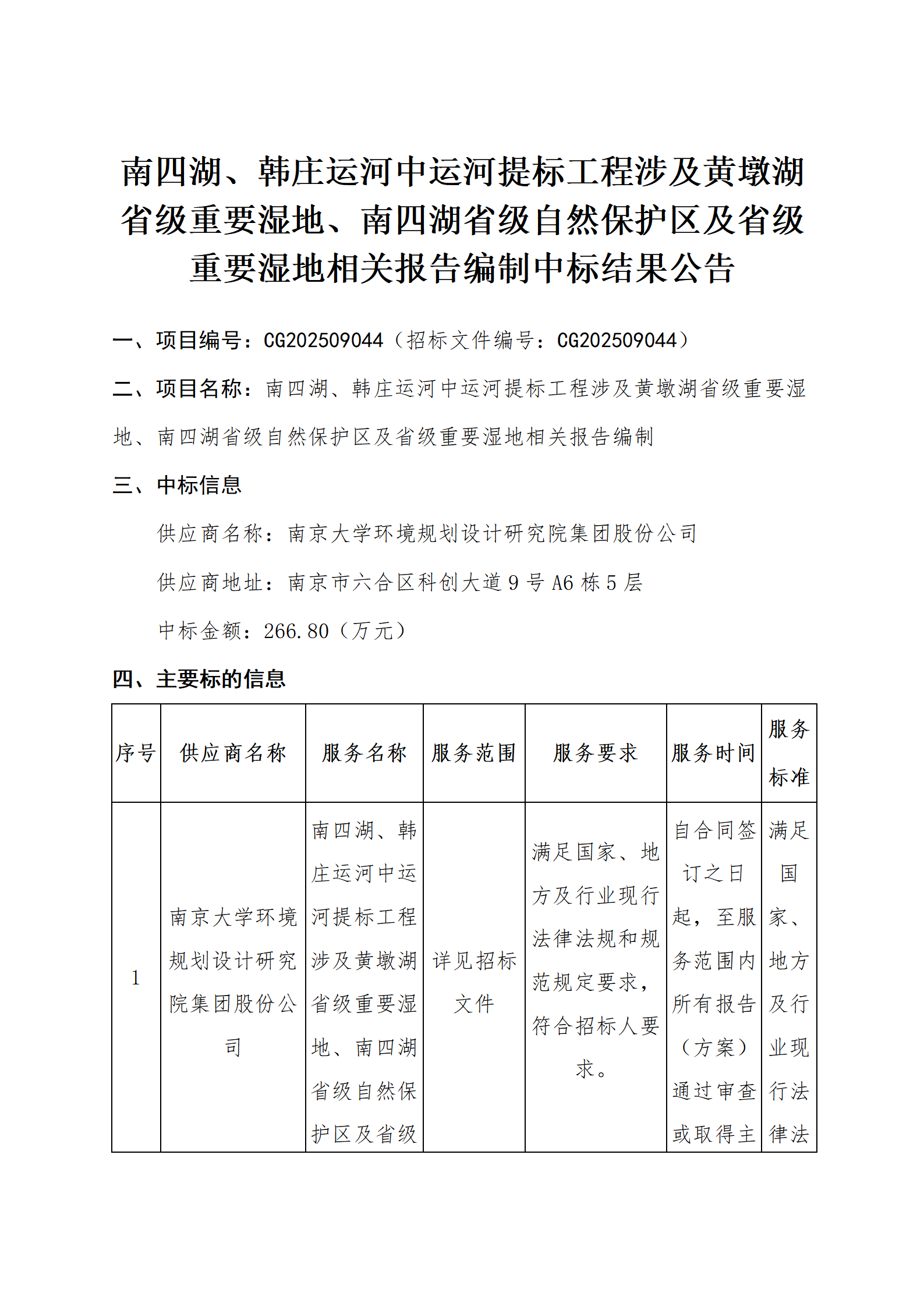 南四湖、韩庄运河中运河提标工程涉及黄墩湖省级重要湿地、南四湖省级自然保护区及省级重要湿地相关报告编制中标结果公告