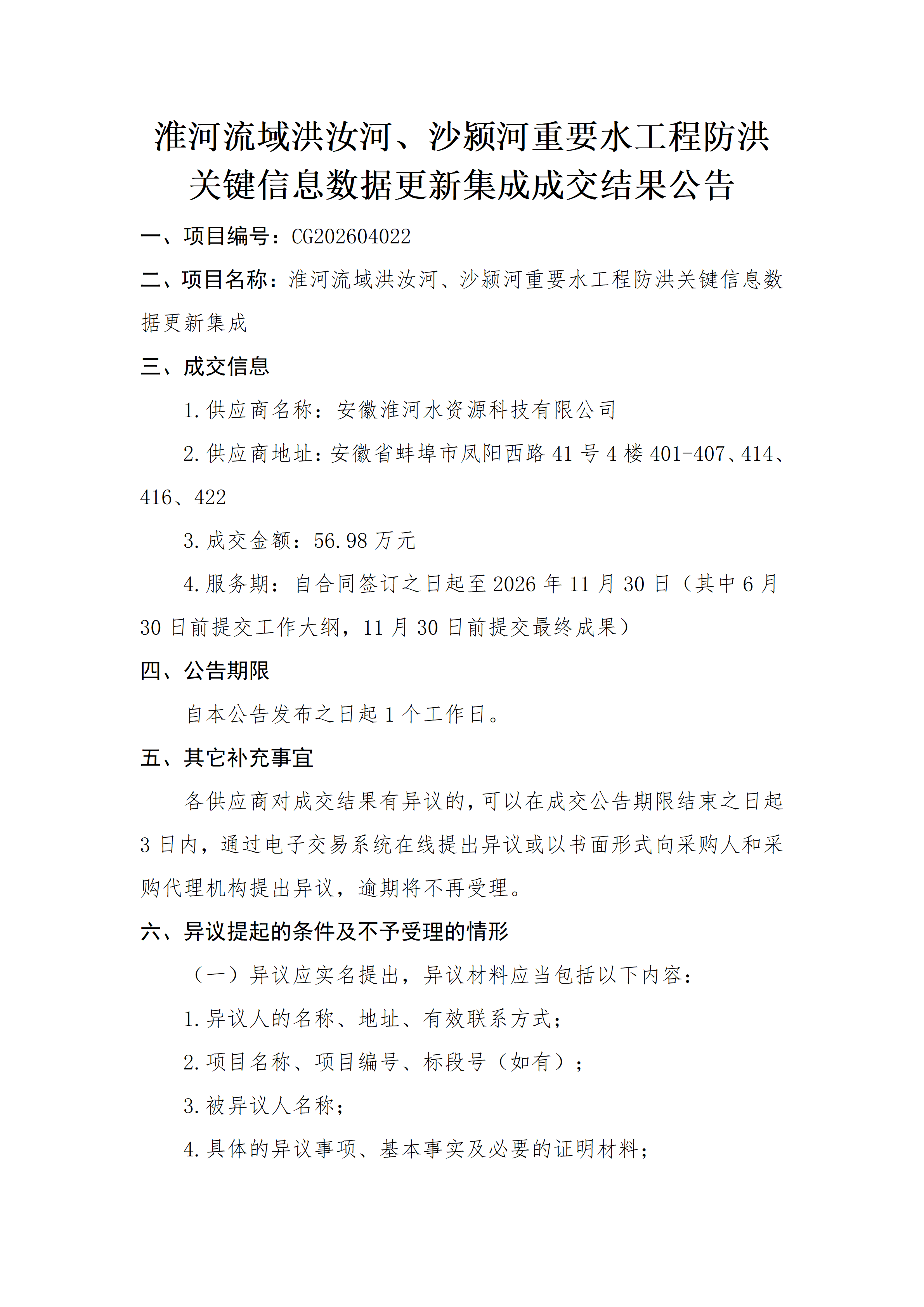 淮河流域洪汝河、沙颍河重要水工程防洪关键信息数据更新集成成交结果公告