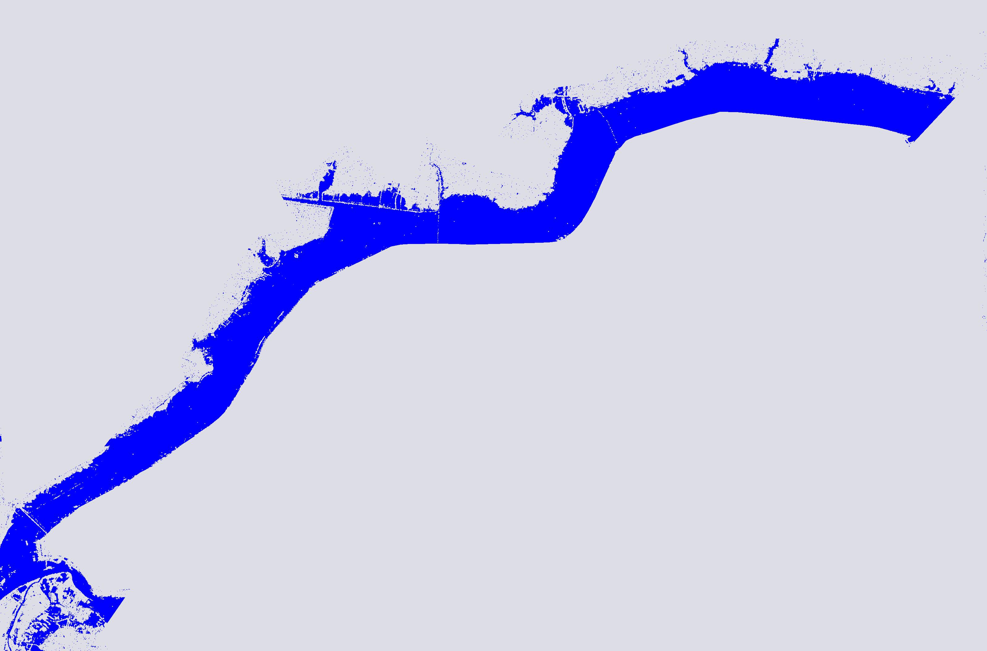 用非汛期SPOT5卫星遥感数据作为背景资料(图1),以最新获取的2007年7月15、16日两景RADARSAT-1数据,对数据进行几何精校正后,提取卫星成像时间的洪涝水体空间分布范围(图2、图3)。通过对比分析SPOT5和RADARSAT-1数据,得到了洪水淹没区范围。本次评估范围从王家坝进洪闸(115°5′57″E,32°5′55″N)向东至曹台孜退水闸(115°6′26″E,32°6′6″N)区间的濛洼蓄洪区及其北部的濛河分洪道。