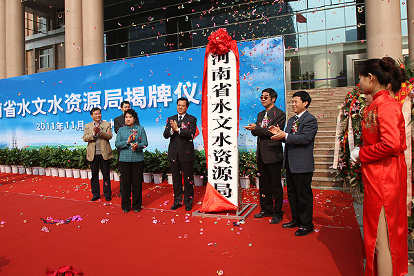 最后,在热烈而隆重的气氛中,河南省水利厅党组书记、厅长,河南省南水北调中线工程建设领导小组办公室主任,省政府移民办公室主任王树山和水利部水文局副局长蔡建元共同为河南省水文水资源局揭牌,伴随着礼花和音乐,河南省水文水资源局揭牌仪式圆满结束。