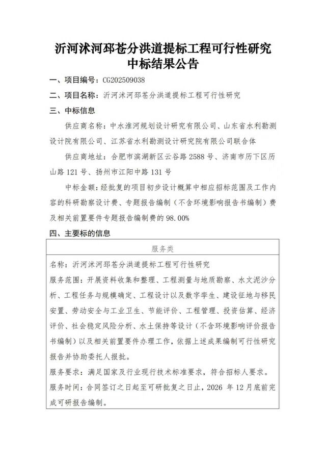 沂河沭河邳苍分洪道提标工程可行性研究中标结果公告