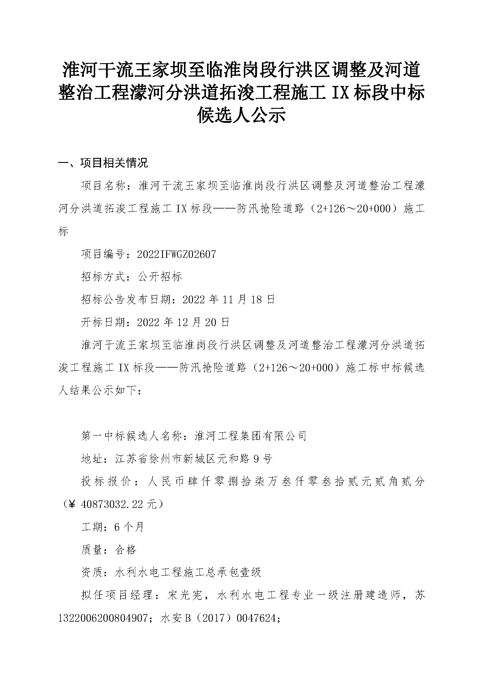 第一中标候选人名称:淮河工程集团有限公司