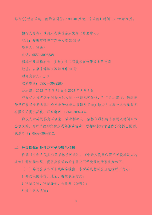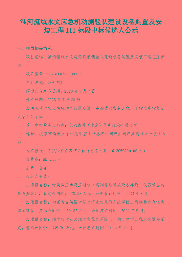 淮河流域水文应急机动测验队建设设备购置及安装工程III标段中标候选人公示